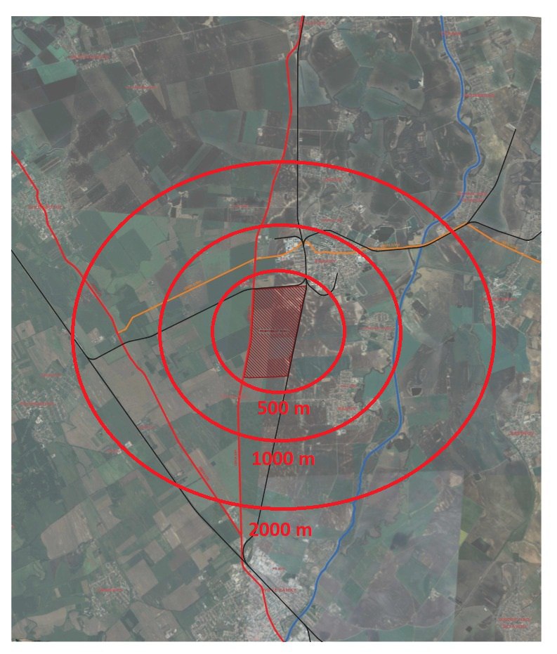 👉ozónovať pozemky v okolí parcely, na ktorej má baterkáreň stáť, na okruhy vo vzdialenostiach 500, 1000 a 2000m (pripadne iné)